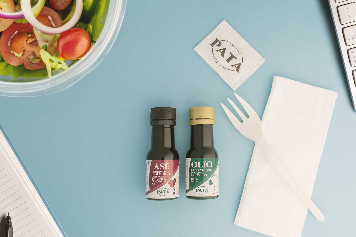 PATA To Go è la linea di condimenti in bottiglia monodose ad ALTO CONTENUTO DI SERVIZIO destinata al consumatore moderno che si aspetta qualità e gusto senza rinunciare alla comodità. La bottiglia monodose Pata To Go, è comoda da aprire e richiudere, è igienica e non unge, è tascabile, infrangibile e riciclabile, contiene la giusta quantità di prodotto. Per queste sue caratterische è perfetta per condire insalate e zuppe pronte, per condire pranzi veloci in uffi cio o fuori casa, da portare al pic-nic, da mettere nello zaino dei bambini, e con gli oli aromatizzati puoi guarnire la tua ricetta speciale